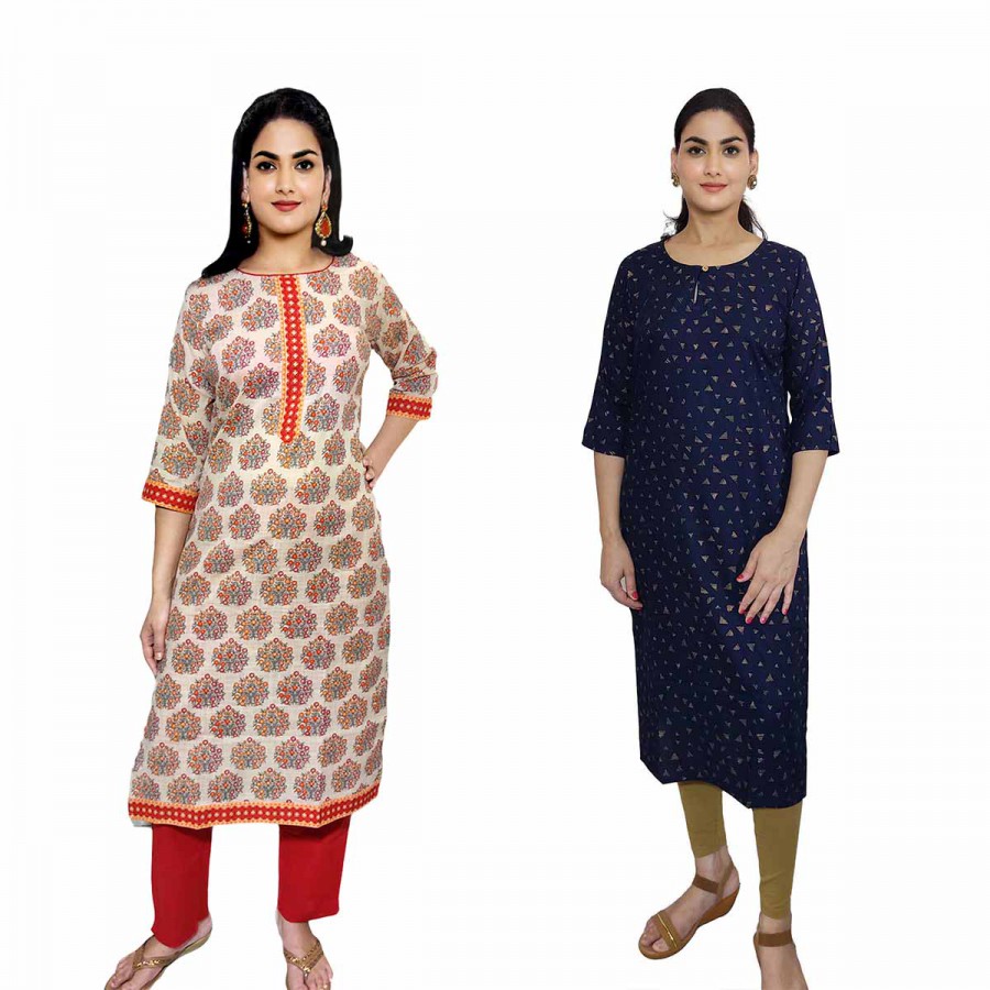 Women Printed Rayon & Cotton Straight Kurti ( Pack of 2 )