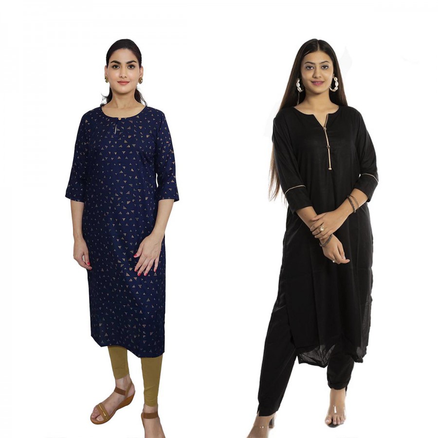 Women Printed Rayon & Solid Rayon Straight Kurti ( Pack of 2 )