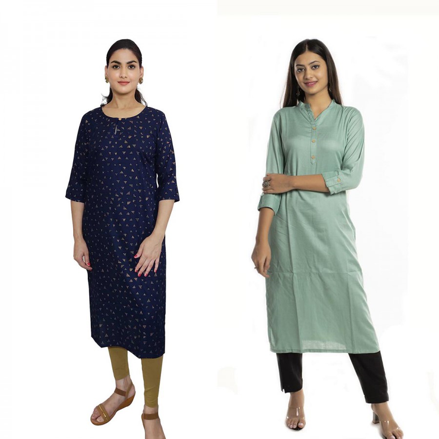 Women Printed Rayon & Solid Rayon Straight Kurti ( Pack of 2 )